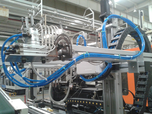 2014年10月,我們成功為格力電器公司研發(fā)出一款可以自動抓取風(fēng)葉進(jìn)行動平衡檢測的機(jī)械手。空調(diào)外機(jī)的風(fēng)葉經(jīng)注塑機(jī)注塑成型后由機(jī)械臂取出并放置到皮帶線上送走。機(jī)械手和注塑機(jī)配合,定期接取風(fēng)葉放置到動平衡機(jī)上進(jìn)行抽檢,合格后自動抓取放回皮帶線,不合格則報警提示。